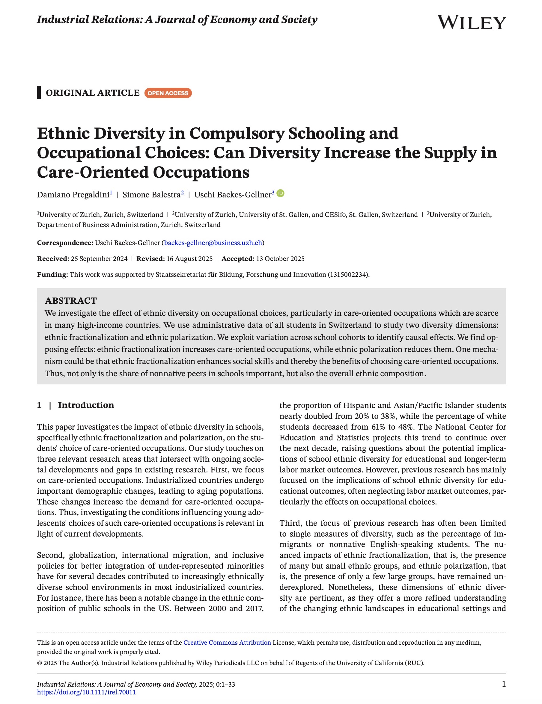 "Ethnic Diversity in Compulsory Schooling and Occupational Choices: Can Diversity Increase the Supply in Care-Oriented Occupations." Industrial Relations (2025). By Damiano Pregaldini, Simone Balestra & Uschi Backes-Gellner. https://doi.org/10.1111/irel.70011