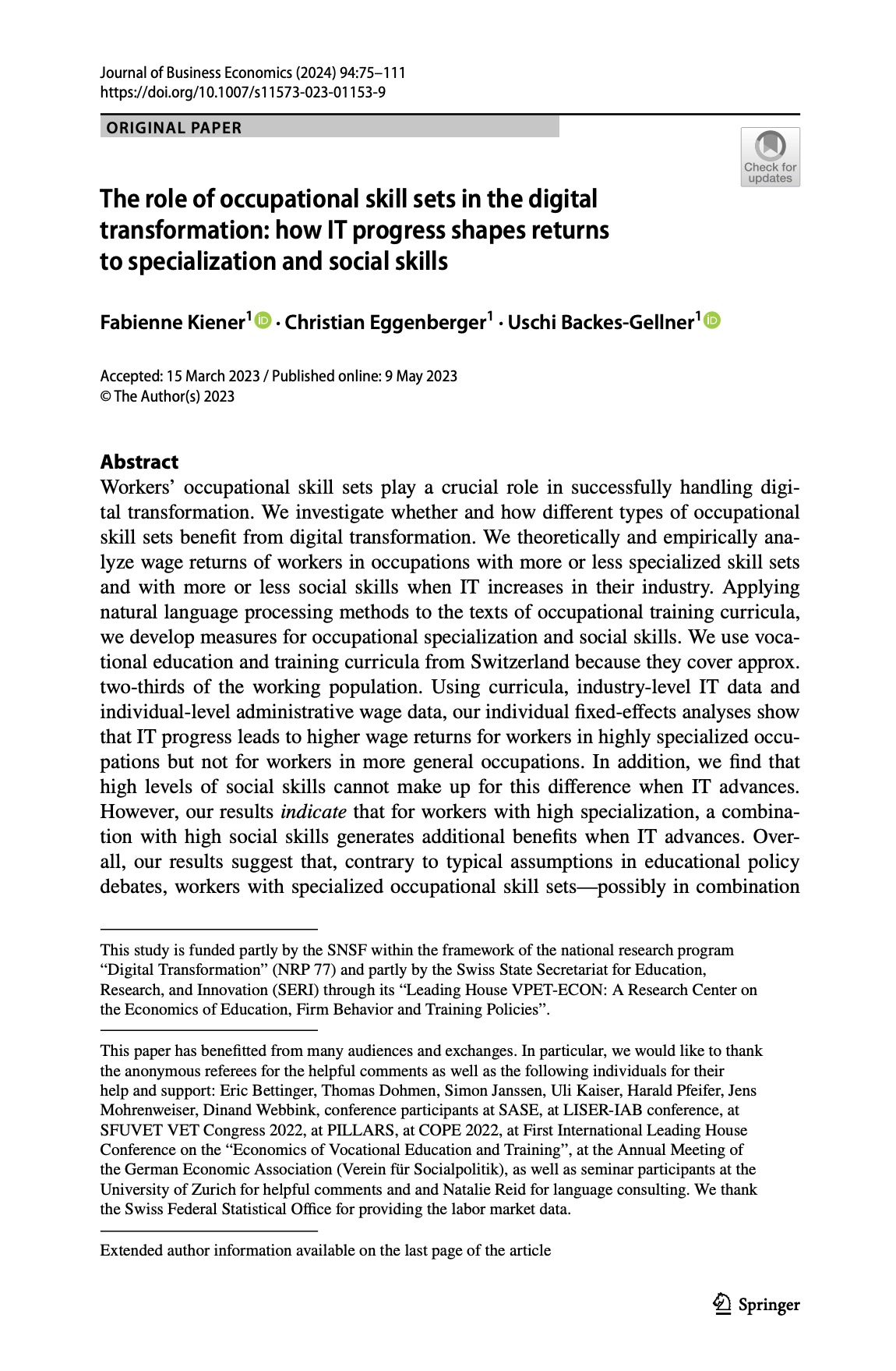 "The role of occupational skill sets in the digital transformation: how IT progress shapes returns to specialization and social skills." Journal of Business Economics, 94(2024): 75–111. By Fabienne Kiener, Christian Eggenberger & Uschi Backes-Gellner.