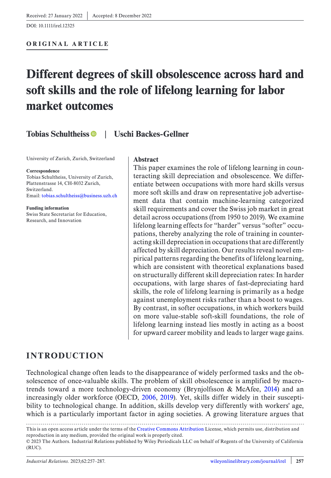 "Different degrees of skill obsolescence across hard and soft skills and the role of lifelong learning for labor market outcomes." Industrial Relations, 62(2023)3: 257-287. By Tobias Schultheiss & Uschi Backes-Gellner. https://doi.org/10.1111/irel.12325