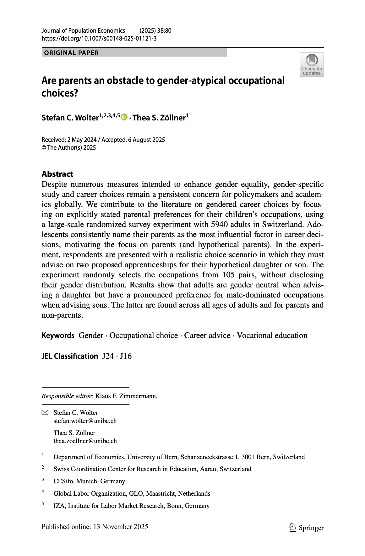"Are parents an obstacle to gender-atypical occupational choices?" Journal of Population Economics, 38(2025)80. By Stefan C. Wolter & Thea S. Zöllner.